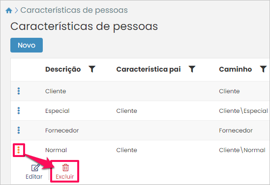 Desta forma será aberta a listagem de características de pessoas já cadastradas no sistema. Para deletar algum destes cadastros você deve clicar nos três pontinhos ao lado do registro desejado e depois pressionar o botão Excluir.