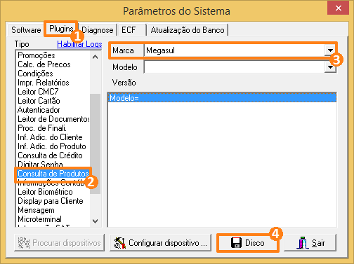 O segundo passo é incluir a DLL ConsultaERPWeb no plugin Consulta de Produtos. Para isso, abra o Param.exe e clique na guia Plugins. Depois, selecione Consulta de Produtos e, no campo Marca, utilize a seta para escolher “Megasul”. Na sequência, pressione o botão Disco. Conforme a imagem abaixo: