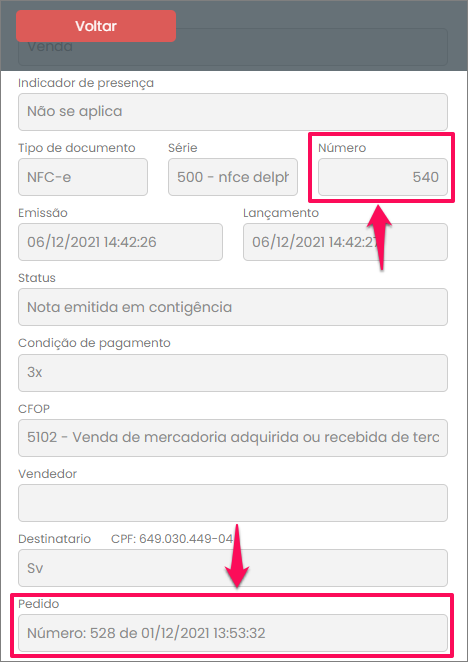 Na parte superior, no campo Número, é mostrada a identificação desta operação realizada no Caixa. Já na parte inferior, no campo Pedido, são exibidos dados do pedido lançado no VarejoCloud.