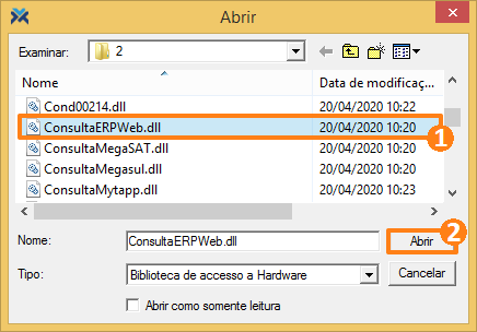 Assim, o sistema exibirá a tela para busca de DLLs. Procure pelo arquivo ConsultaERPWeb.dll e selecione-o, depois pressione o botão Abrir: