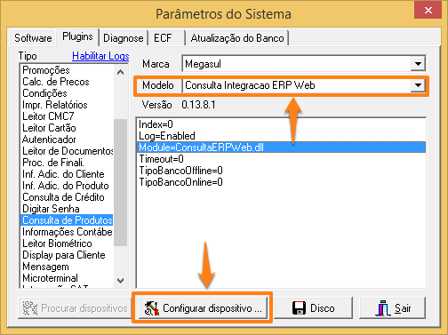 Na sequência, basta utilizar a seta do campo Modelo para selecionar “Consulta Integracao ERP Web” e depois pressionar o botão Configurar dispositivo…
