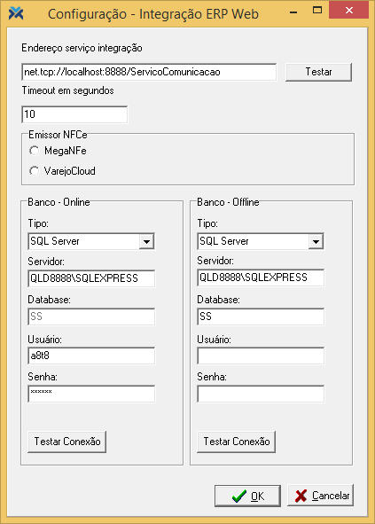 Nesta tela deve ser incluído o endereço do serviço de integração. Caso a operação aconteça com NFC-e, selecione a opção MegaNFe. Depois, insira os dados necessários para conectar o banco.