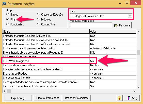 Na sequência, abra o Retaguarda e acesse: Parâmetros > Parametrização. Clique no grupo Filial e, no campo Item, selecione a filial para a qual a configuração será válida. Na listagem abaixo procure pelo parâmetro ERP Web: Integração e configure-o como “Sim”.