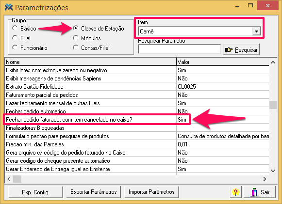 Por fim, clique no grupo Classe de Estação e, no campo Item, selecione a classe para a qual a configuração será válida. Na listagem abaixo procure pelo parâmetro Fechar pedido faturado, com item cancelado no caixa? e configure-o como “Sim”.