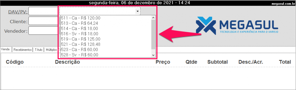 Com o pedido lançado abra o Caixa. Logo na guia Venda, no campo DAV/PV, você pode carregar o pedido desejado. Ao clicar na seta deste campo, habilitando a pesquisa, você já verá os pedidos lançados no VarejoCloud todos listados.