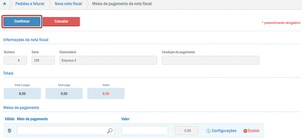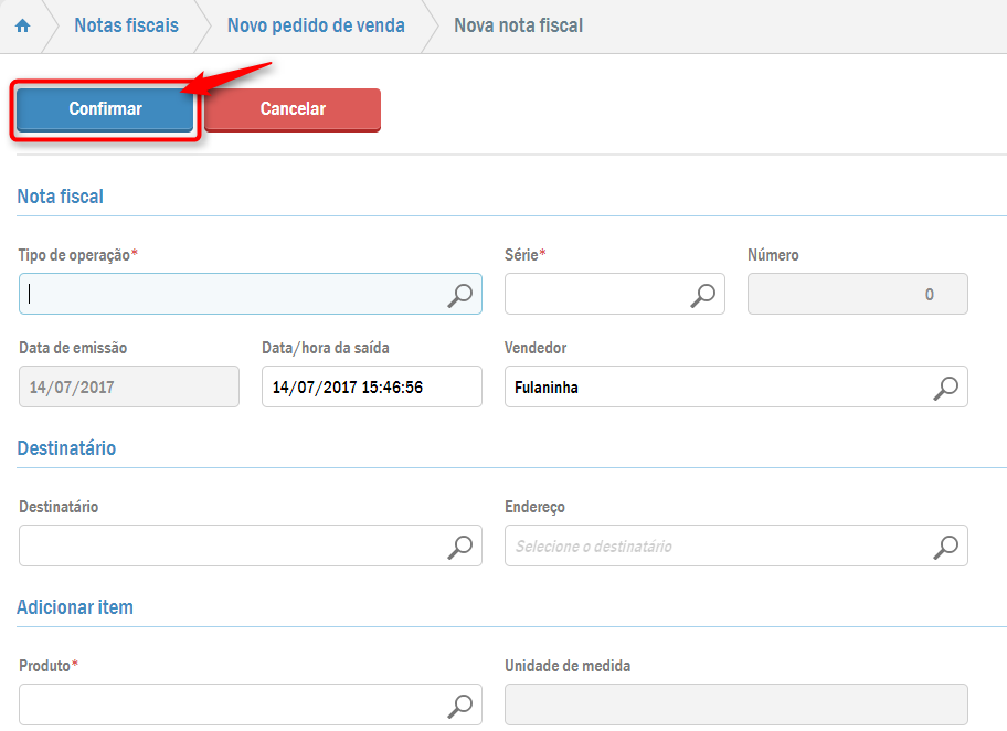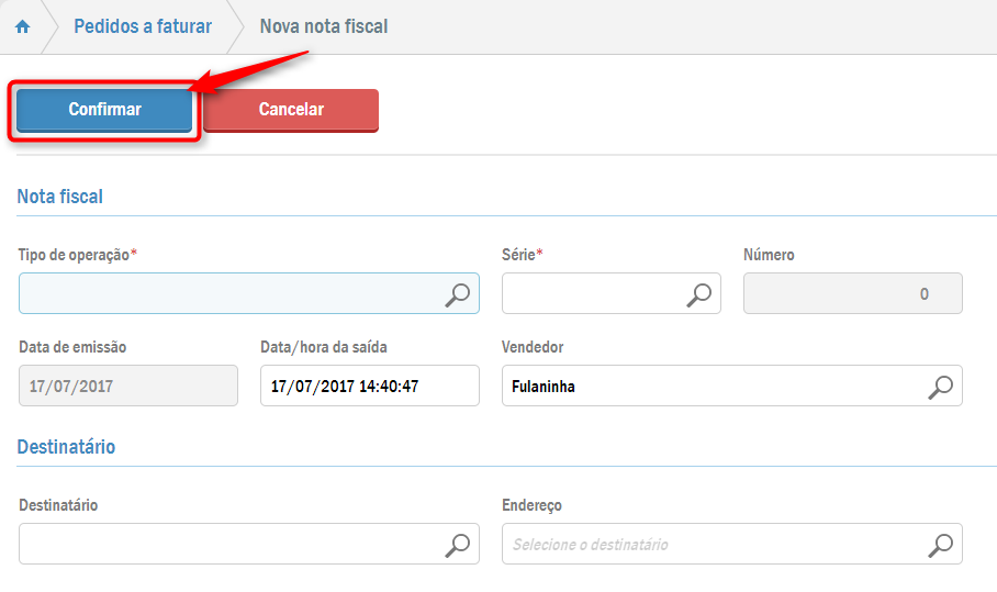 Na tela seguinte, o sistema redirecionará o usuário para a etapa de digitação da nota fiscal do pedido em faturamento. Como o pedido já está criado, alguns campos poderão ser automaticamente preenchidos. Os demais deverão ser preenchidos pelo usuário. Por fim, clique em Confirmar: