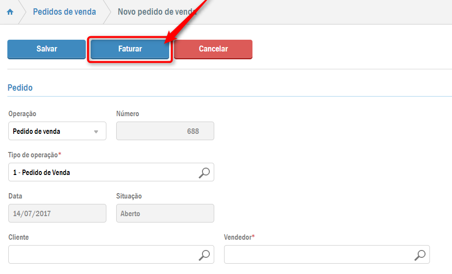 Ao clicar em Novo, o sistema leva o usuário para a tela de cadastro de um novo pedido de venda. Nela, preencha os dados necessários para completar a criação do pedido. Repare, em seguida, na opção Faturar. Utilizando-a, o pedido será automaticamente criado e enviado para faturamento: