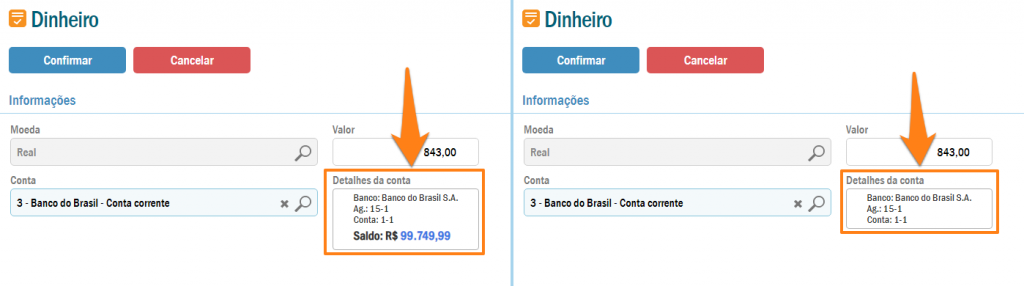 Caso quem estiver fazendo a operação tiver a autorização de campo em tela: Contas tesouraria > Saldo, o saldo da respectiva conta será exibido nesta tela, conforme a imagem da esquerda. Caso contrário, o saldo será omitido, conforme a imagem da direita.