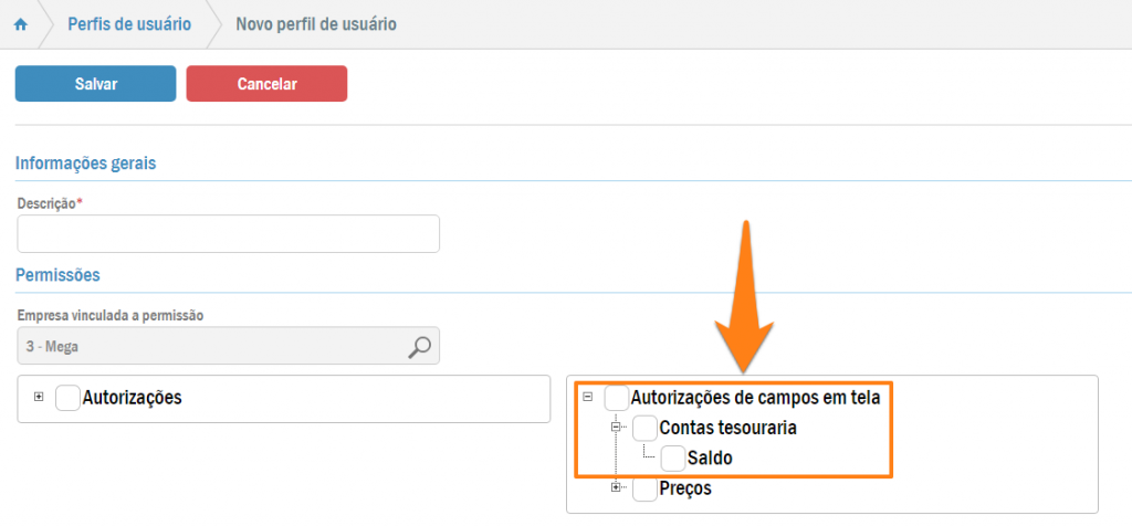 Para configurar as autorizações de campos em tela de alguém, acesse: Menu > Segurança > Perfis de usuário.
