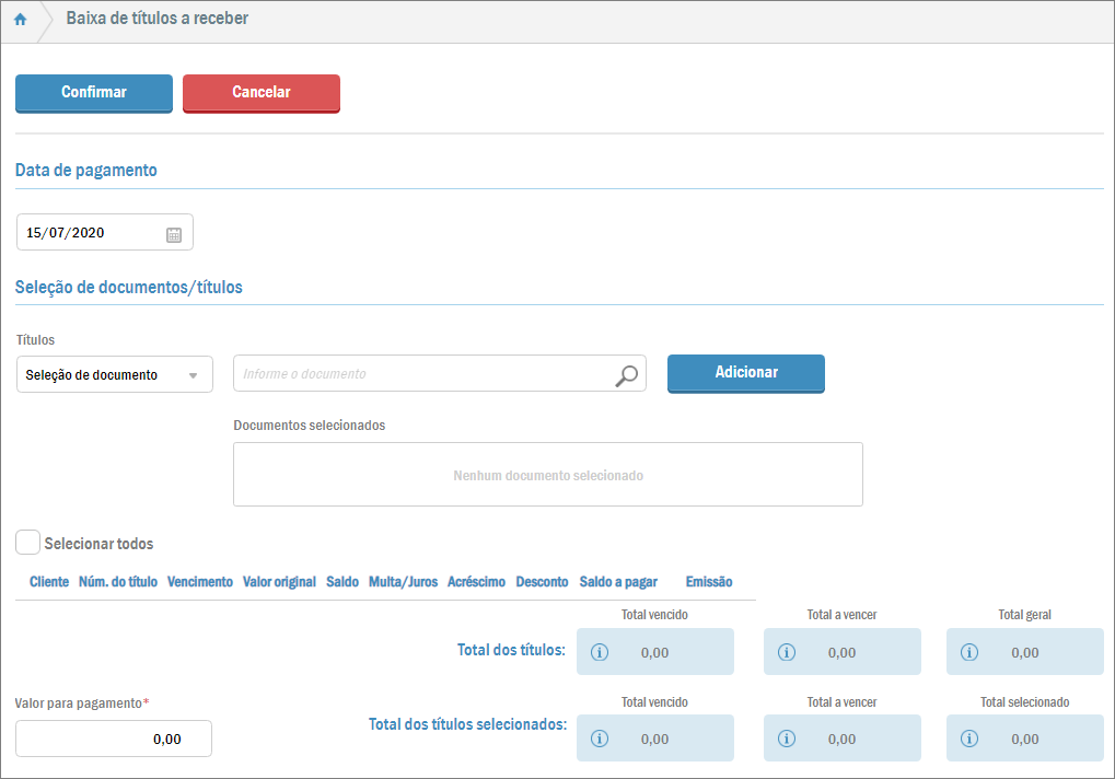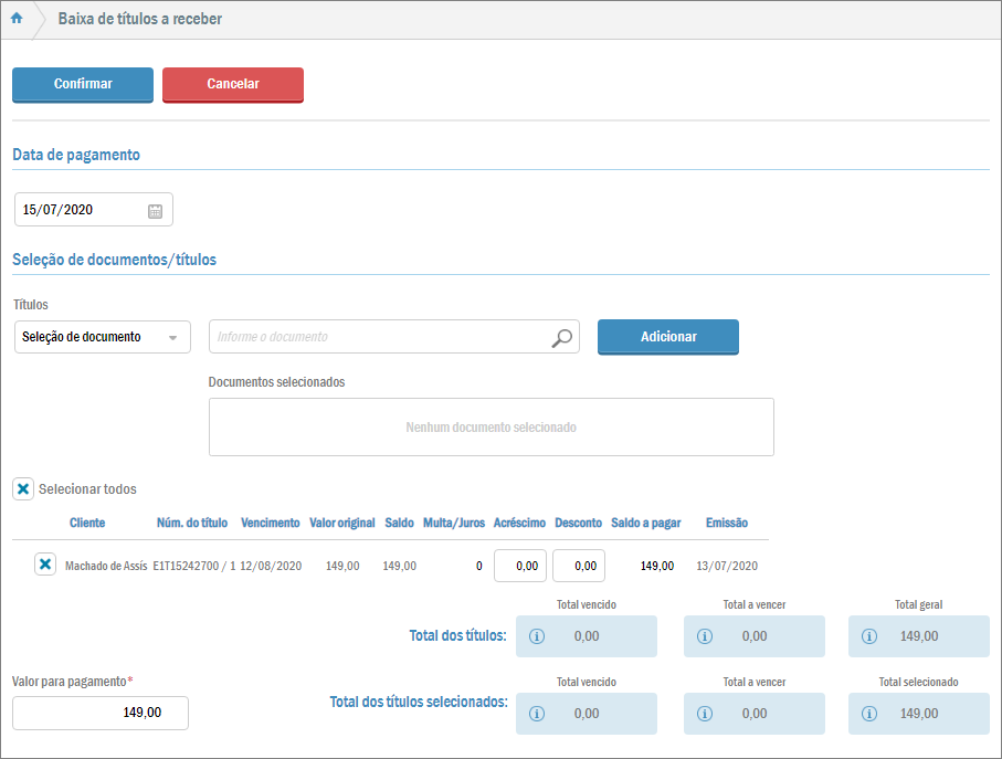 No campo Data de pagamento o sistema informará automaticamente a data atual, mas você pode modificá-la. Mais abaixo é possível adicionar um acréscimo ou desconto para o título. Ainda é possível acrescentar outros títulos para serem baixados juntos através da guia Seleção de documentos/títulos.