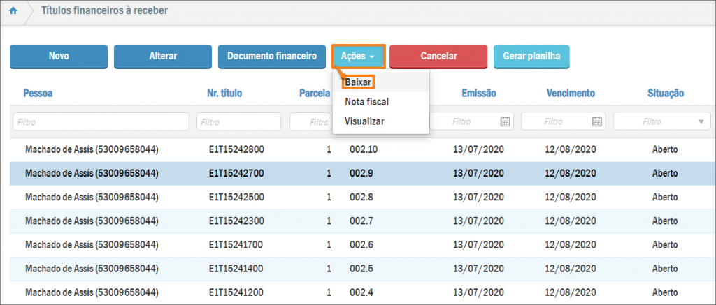 Assim, você abrirá a listagem com todos os títulos a receber cadastrados no sistema. Selecione aquele que você deseja baixar. O sistema habilitará alguns botões, entre eles o Ações. Pressionando-o, serão apresentadas outras opções, dentre elas está Baixar: