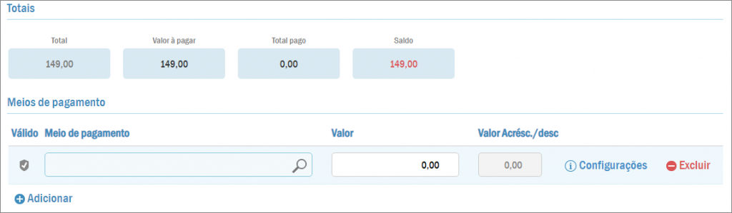 Ao lado do meio de pagamento encontra-se o botão Configurações, que é necessário para alguns meios de pagamento, como por exemplo cheque e cartão de crédito. Você precisa pressionar este botão e inserir as informações que o sistema vai pedir, como a bandeira e a administradora, entre outras.