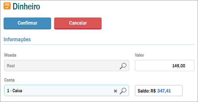 Pressione o botão Confirmar e o sistema requisitará o meio de pagamento deste título. Você pode selecionar o meio desejado e ao lado o valor que será pago.