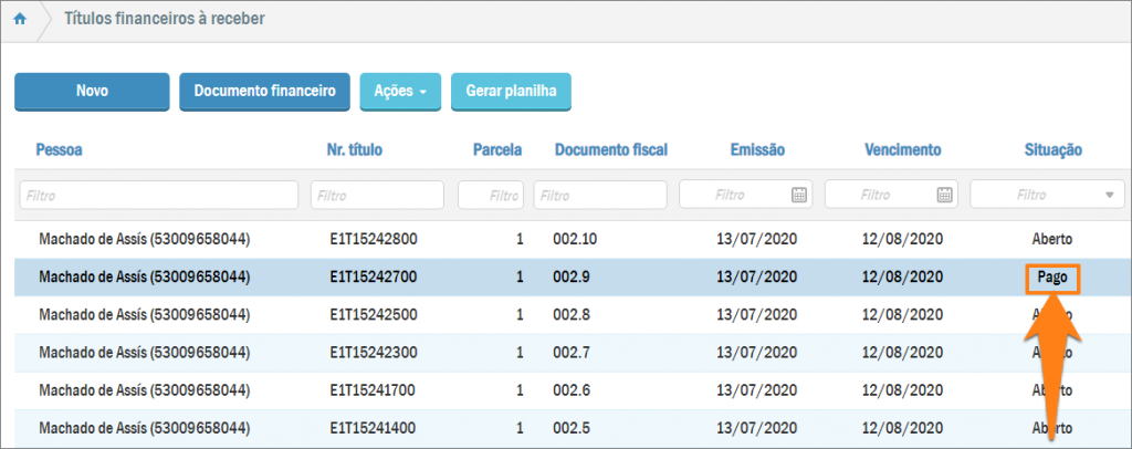 Assim, quando você retornar à listagem de títulos financeiros a receber verá que o título em questão estará com a Situação “Pago” (apenas se o título tiver sido baixado por completo).