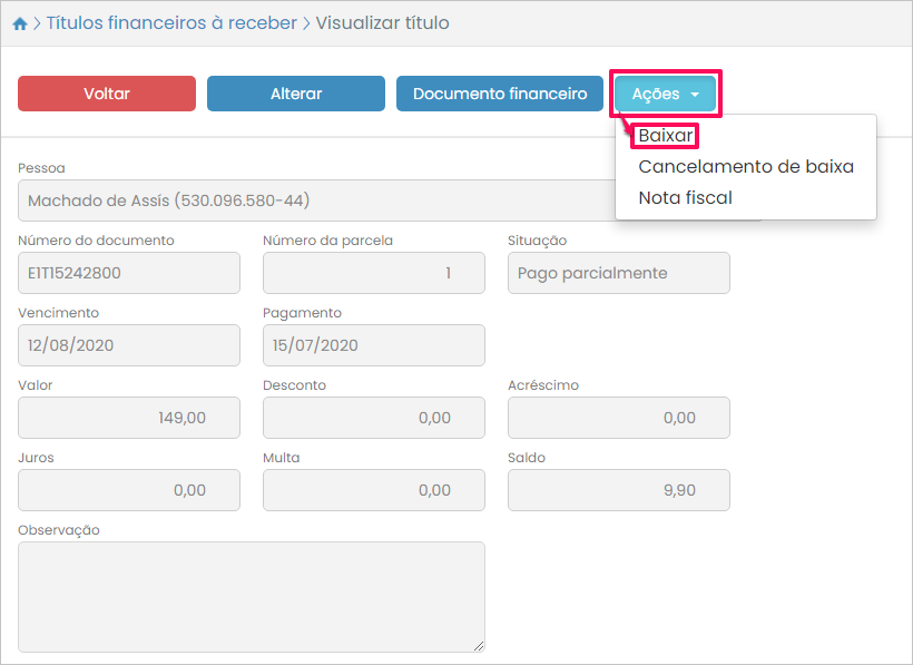 Ainda cabe um parêntese dentro desta primeira opção de baixa: caso você ao selecionar o título, em vez de solicitar sua baixa, pressionasse o botão Visualizar, seria possível efetuar a baixa dentro da tela de visualização. Bastaria pressionar Ações > Baixar.
