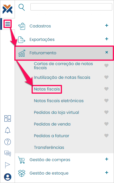Para iniciar o processo acesse: Menu > Faturamento > Notas Fiscais.