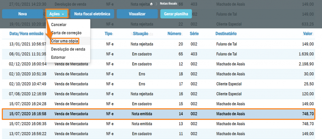 Desta forma será exibida a listagem de notas fiscais cadastradas no sistema. Você só pode fazer a cópia de uma nota que esteja em situação: emitida. Selecione a desejada e depois pressione Ações > Criar uma cópia.
