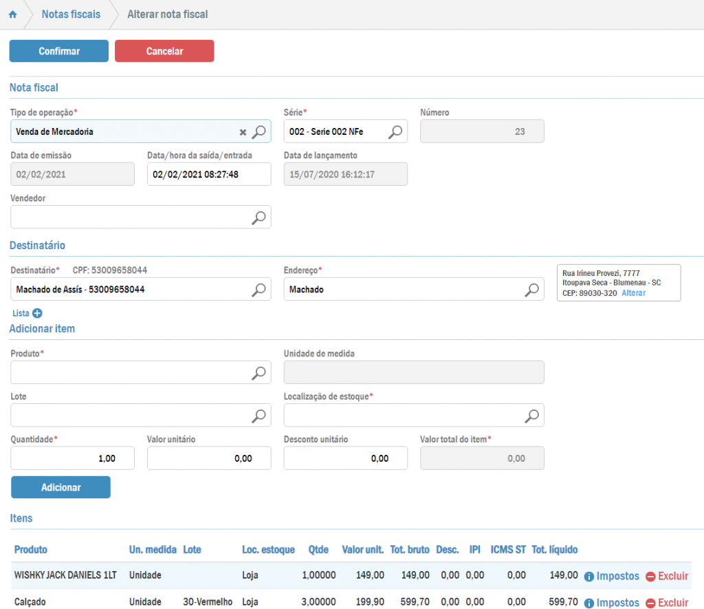 Assim será aberta uma tela com os dados da nota fiscal a ser copiada. Você pode fazer as alterações que desejar.