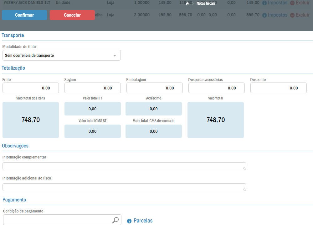 Continuando a descer a página será possível ainda modificar dados referentes ao transporte, informação complementar ou informação ao fisco.