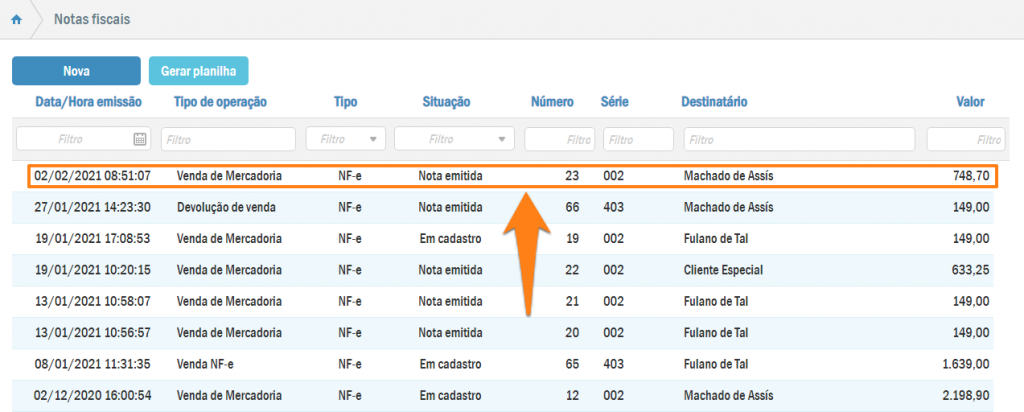 Depois da autorização, ao retornar à listagem de notas fiscais, você verá a nova nota listada como emitida!