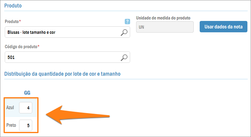 No exemplo abaixo, a nota fiscal importada tem uma blusa com quantidade= 9. Todas elas são GG, mas algumas são pretas e outras são azuis. Então, assim que o código deste produto for informado, o sistema transformará o campo Lote em dois campos diferentes: Azul e Preto. Basta você digitar neles a quantidade de blusas de cada cor.