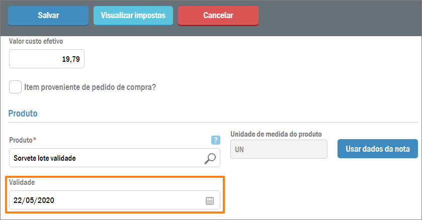 Vale destacar que, no exemplo acima, caso você utilizasse o botão Usar dados da nota e o produto não existisse no sistema, o lote seria uma das pendências que você teria que resolver no cadastro do produto.