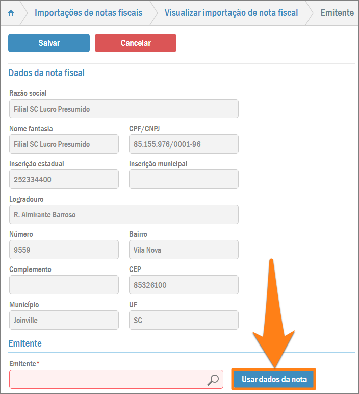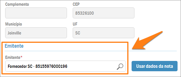 Caso houver pendências de emitente, basta pressionar o botão Usar dados da nota.