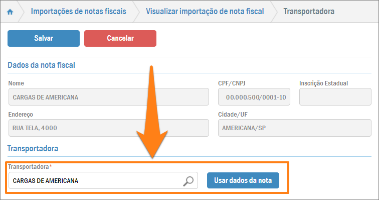 O botão Usar dados da nota também está disponível para as transportadoras, puxando dados da transportadora da nota fiscal, mesmo se não houver dados suficientes para cadastrar o endereço.