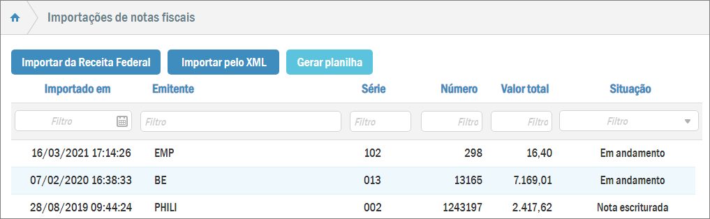 Na listagem de importação de notas fiscais, esta nota terá a Situação: Nota escriturada.