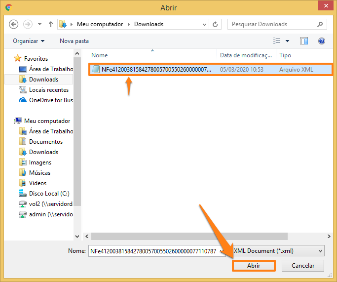 Por fim, clique na seta do campo Arquivo para que a tela Abrir do Windows seja exibida. Navegue até o local onde se encontra o XML, selecione-o e clique no botão Abrir: