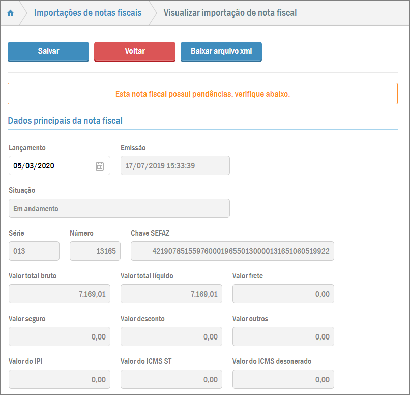 Assim, serão mostrados os dados da nota e o sistema avisará que existem pendências: