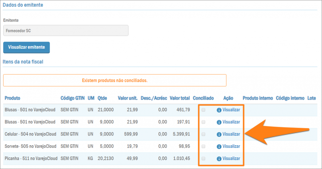 No exemplo acima, o problema é que os produtos não estão conciliados. Na listagem, o campo Conciliado aparece vazio para todos eles. Quando a conciliação for feita, aparecerá um check neste campo. Para resolver a questão, clique no botão Visualizar ao lado de cada produto.