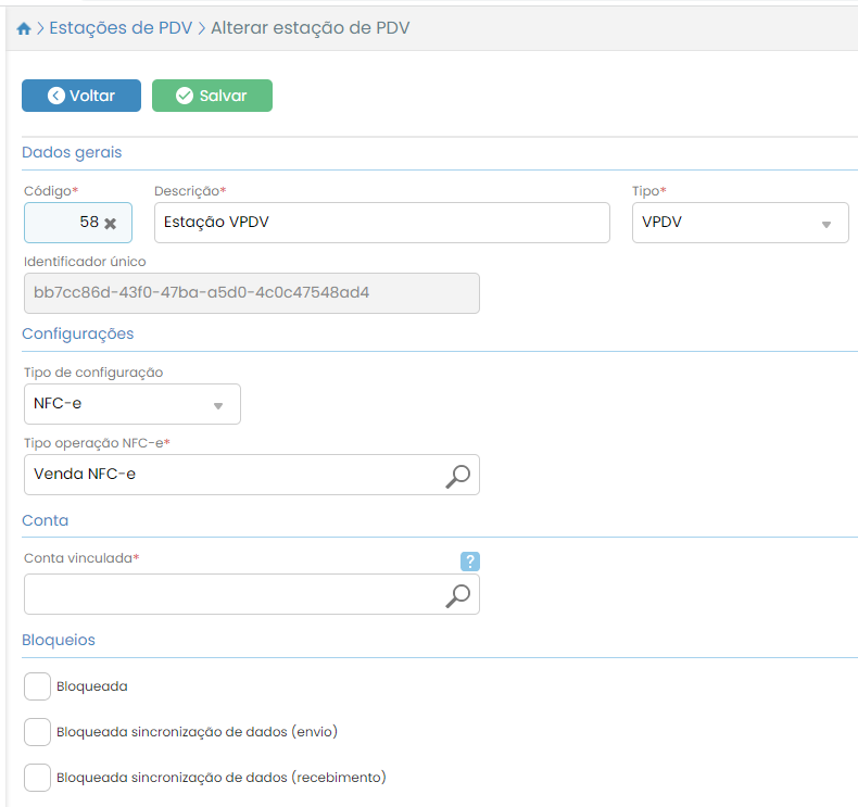 Preencha as informações do cadastro de PDV, com o campo “Tipo” valorado como “VPDV“.