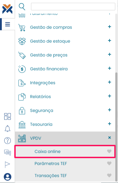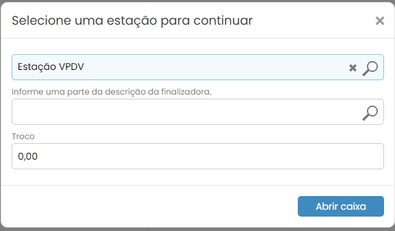 Após o cadastro da estação, será criada uma nova opção no menu inicial, chamada VPDV. Clique nesta opção e entre na guia Caixa online para começar suas vendas no VPDV.Ao entrar no Caixa online, será solicitado que selecione a estação onde serão efetuadas as modificações e informe as opções de Finalizadora e Troco.