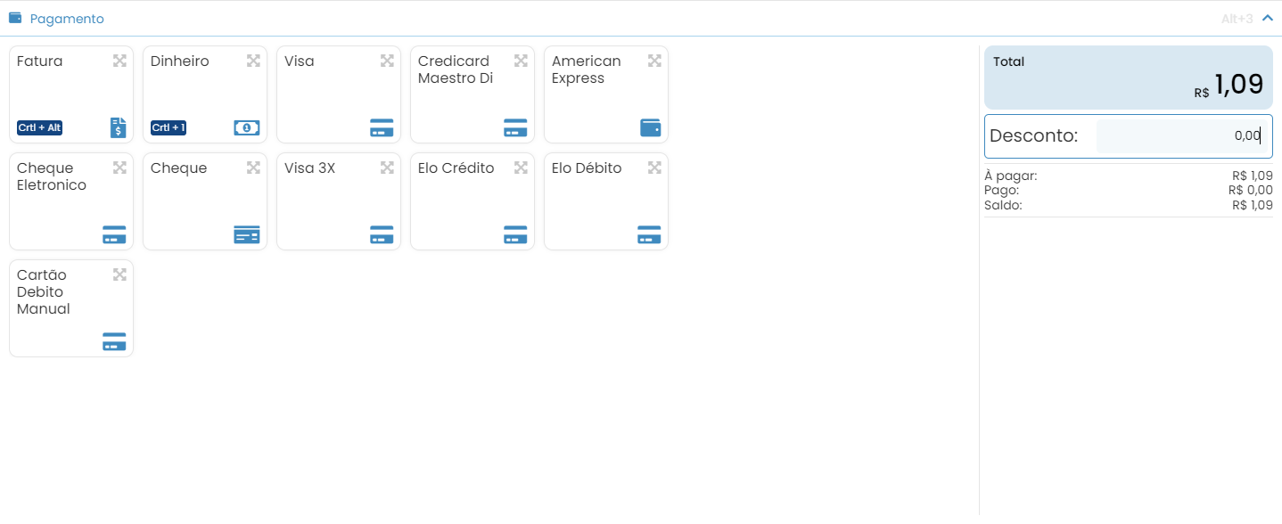 Por fim, vá até a guia Pagamento e informe o meio de pagamento e se há algum desconto. Em razão do meio de pagamento selecionado, poderão ser solicitados dados complementares necessários para a finalização da venda.