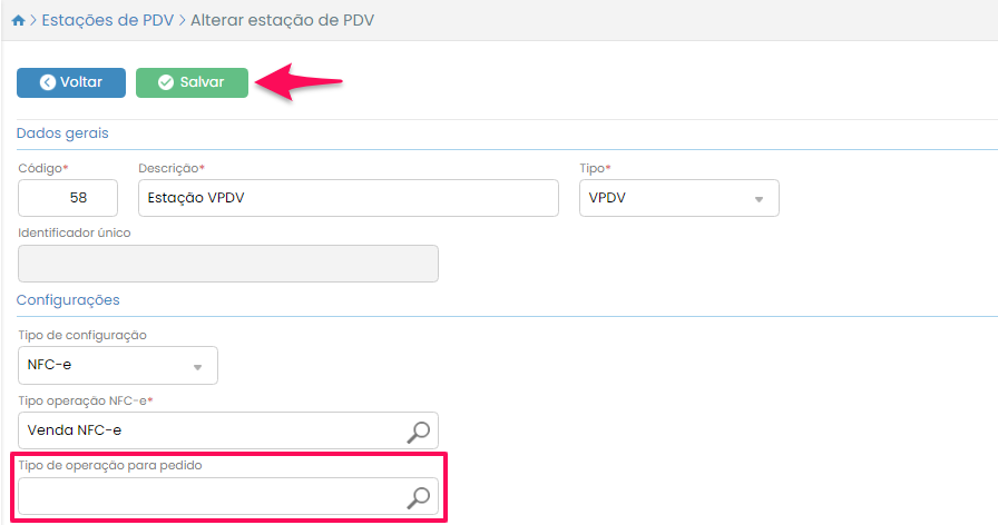 Escolha a estação onde você deseja realizar emissões de pedidos e no campo Tipo de operação para pedido selecione um tipo. Clique em Salvar.