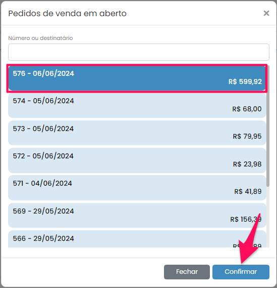 Será aberta uma janela com a lista de pedidos de venda em aberto. Você pode procurar o pedido pelo número identificador ou pelo nome do cliente. Clique no(s) pedido(s) que você deseja faturar e no botão Confirmar.