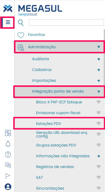 Para ser possível realizar um pedido de venda, é necessário definir um tipo de operação para pedidos na estação VPDV cadastrada anteriormente. Para isso, clique no botão para acessar o menu e vá em Administração > Integração ponto de venda > Estações PDV.