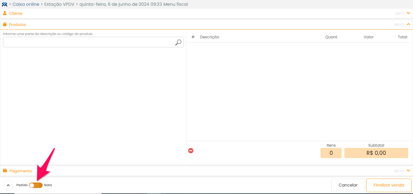 Após clicar no botão Abrir caixa, você será direcionado para a tela principal, que está divida em Cliente, Produtos e Pagamento.