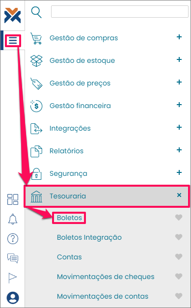 Para iniciar a geração de remessa o caminho é o seguinte: Menu > Tesouraria > Boletos.