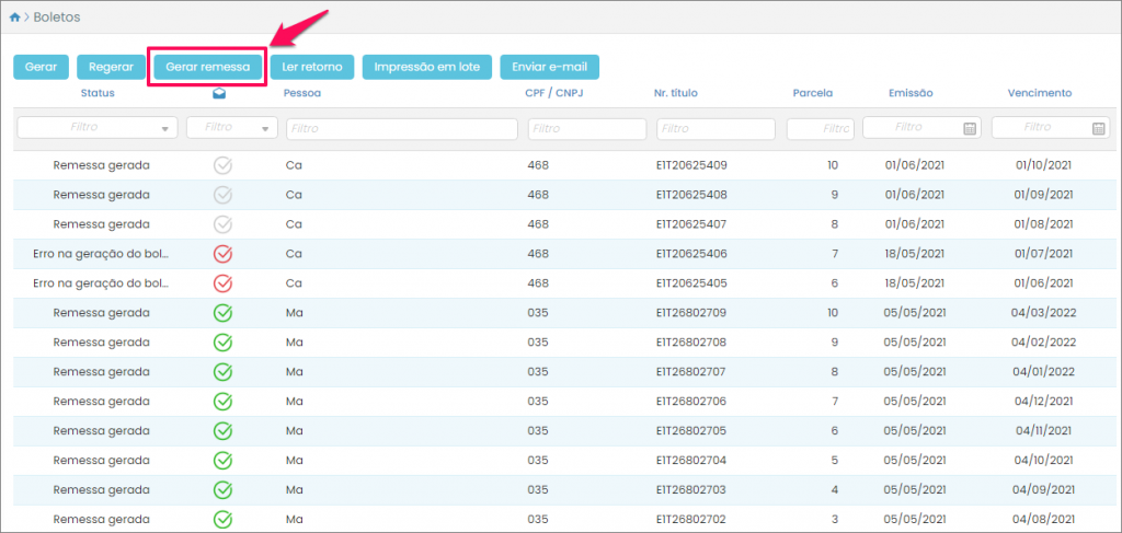 Depois de gerar boletos no VarejoCloud você deve gerar uma remessa para estes boletos.