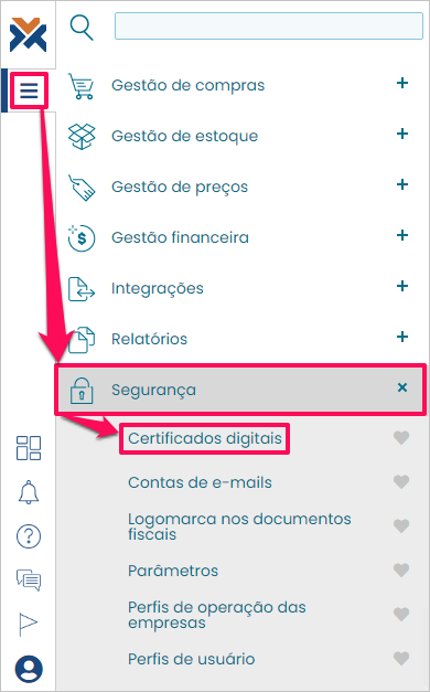 Para iniciar a importação do novo certificado acesse: Menu > Segurança > Certificados digitais.