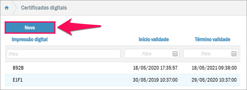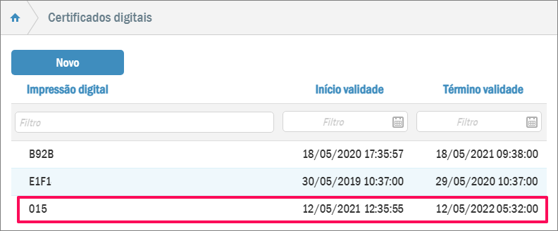 Desta forma serão listados todos os certificados digitais já utilizados pela sua empresa. Todos eles terão do lado a data de início de validade e do final da validade.