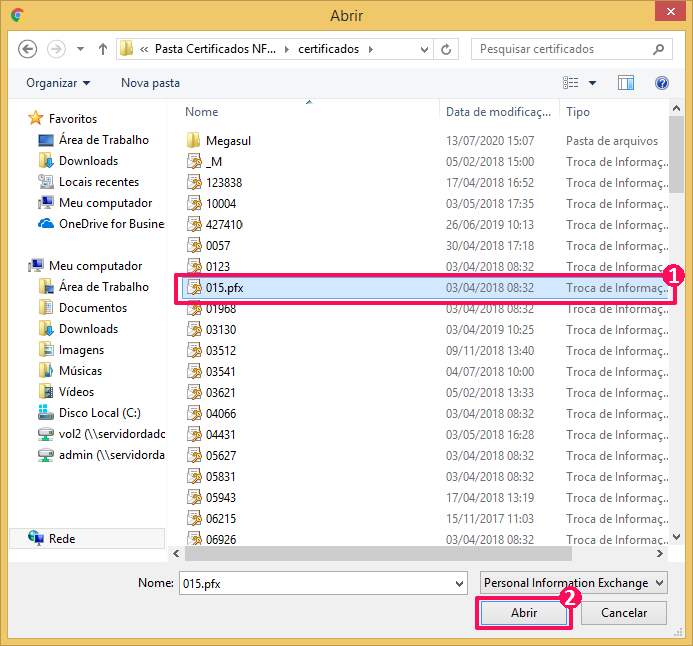 Agora basta navegar por esta tela até encontrar o certificado digital. Com isto feito, selecione o certificado e pressione o botão Abrir. Você retornará ao formulário de certificados digitais.