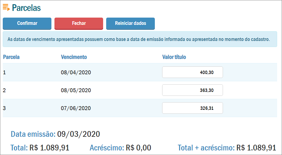 Clicando no botão Parcelas você pode alterar o valor dos títulos. Veja: