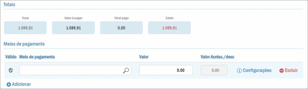 Por fim, vale destacar que, se você confirmar a operação sem informar a condição de pagamento, o sistema requisitará que você preencha o campo Meio de pagamento.