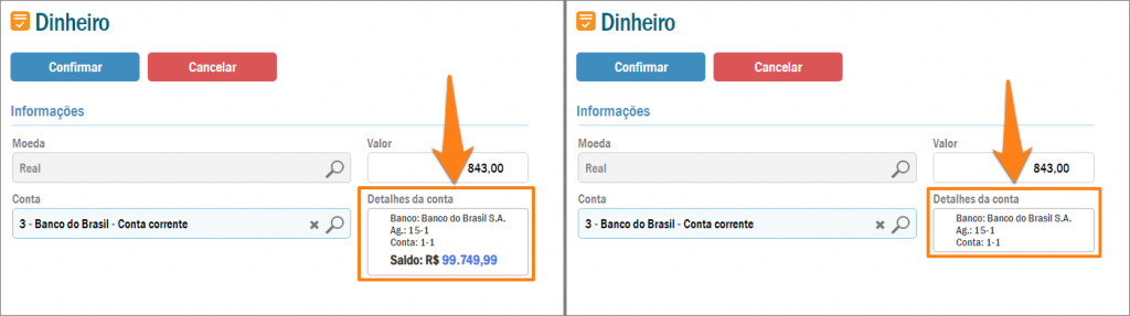 Caso quem estiver fazendo a operação tiver a autorização de campo em tela: Contas tesouraria > Saldo, o saldo da respectiva conta será exibido nesta tela, conforme a imagem da esquerda. Caso contrário, o saldo será omitido, conforme a imagem da direita.