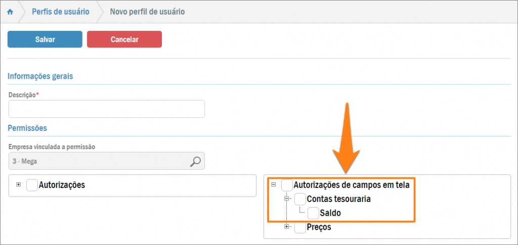 Para configurar as autorizações de campos em tela de algum funcionário acesse: Menu > Segurança > Perfis de usuário.