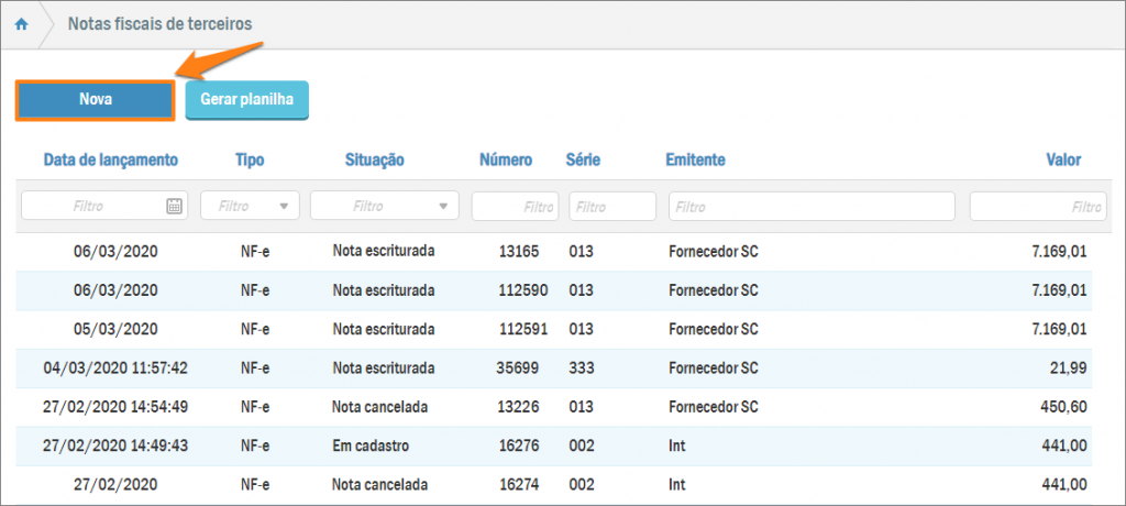 Assim, você abrirá a lista de notas fiscais de terceiros: