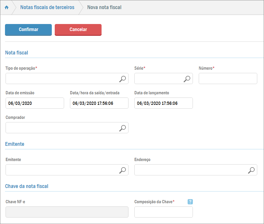 Em todos os campos você pode digitar a informação. Além disso, nos campos em que há uma lupa, você pode clicar nela e selecionar os dados desejados. Os campos com um asterisco vermelho do lado direito são de preenchimento obrigatório, os outros são opcionais, mas podem adicionar importantes informações para a nota